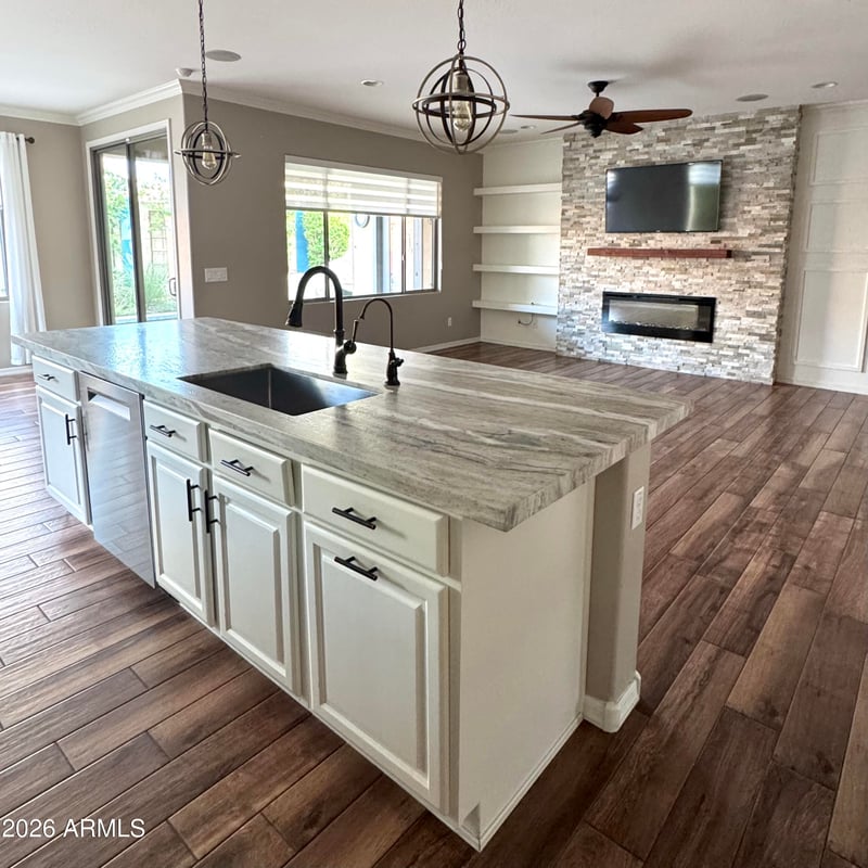 Listing details for 29623 70th Ave, Peoria, AZ 85383 : Gorgeous home surrounded by mountains, with access to walking trails, hiking and neighborhood parks with close proximity to great dining options! Custom stacked stone fireplace, crown molding and trim work highlight a beautiful open living space. Complimented by leathered granite countertops, white kitchen cabinets and new zebra blinds, connecting the indoors to the garden. Greenery surrounds the private pool with rock waterslide, built in BBQ, and travertine extended deck. Formal garden, with enclosed space for connecting pet door. Massive laundry room with cabinet storage, sink, exterior exit, and upgraded quartz countertops. Master bedroom overlooks pool and garden with access door to patio. Upstairs includes loft, one bedroom and large unfinished storage closet (potential for increase square footage with development, third bathroom option). Water softener, tankless water heater, and installed water filter. Outdoor and living room TVs included. This home has been well cared for with continuous updates, move in ready!