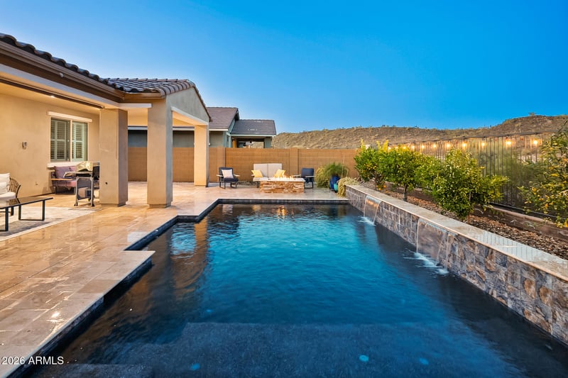 Listing details for 29639 113th Ln, Peoria, AZ 85383 : Well maintained home in Vistancia with great desert and mountain views. Popular Sedona model with 3 bedrooms, 3.5 baths and 1900 square feet. Very livable floor plan with kitchen, great room and eating area all overlooking the amazing back yard space. Kitchen features beautiful cabinetry, granite counter tops, stainless appliances and an island with seating as well as a perfect spot for a dining table. Nice great room with coffered ceilings and sliding door access to outside. Primary retreat with glass barn door to the en suite bath where you will find dual vanities, large step in shower and walk in master closet. Outdoor living is premium with great views from. your large covered patio, sparkling pool with fountains, putting green, nice landscaping and fire pit area. Great Home!