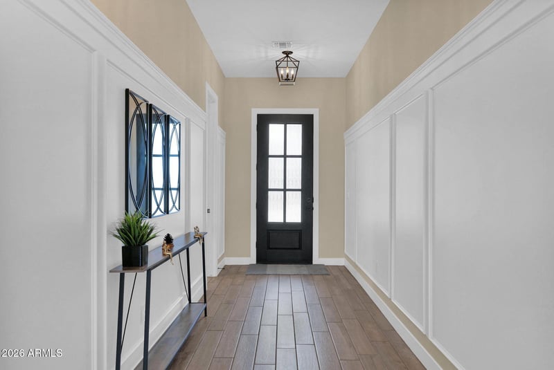 Inside, the home is pristine and truly move-in ready, showcasing designer touches throughout, including wainscoting in the foyer and dining room, framed-in windows, and custom lighting and ceiling fans. The thoughtfully designed floorplan features 4 bedrooms, a den, and an attached casita with its own separate entry, perfect for guests or multigenerational living. At the heart of the home, the luxury kitchen is a showstopper with cabinetry extended to the ceiling, quartz countertops, GE Profile stainless steel appliances, double ovens, an induction cooktop with a gas stub (gas cooktop available!), cabinet rollouts, an extended kitchen counter and built-in beverage fridge, and a large kitchen island with a breakfast bar.