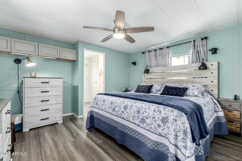 Listing details for 303 Recker Rd #81, Mesa, AZ 85206 : Beautifully updated and move-in ready home with upgrades throughout. Improvements include luxury vinyl plank flooring, remodeled bathrooms, modern lighting, and fresh interior and exterior paint. Accessibility features include a ground-set home with no steps, grab bars in the showers, an easy-access shower, and flooring without transitions for smooth movement throughout. The Arizona room offers a speckled epoxy floor, evaporative cooler, Coolaroo shades, and two storage cabinets. Laundry has been relocated to the carport storage room, allowing space for a large kitchen pantry. Additional storage shed included. Community amenities include a heated pool and spa, bocce ball, shuffleboard, and regular social activities. Lot rent of $939.26 includes water, sewer, and trash.
