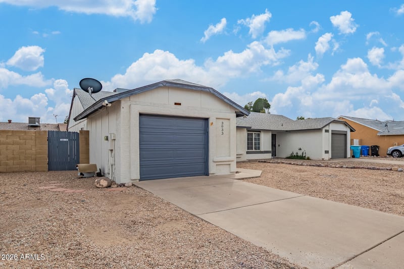 Listing details for 3033 Rose Garden Ln, Phoenix, AZ 85027 : Renovated patio home with 2 bedrooms, 2 baths, and a 1-car garage—all the big items are done! Updated kitchen features maple cabinets, granite countertops, stainless steel appliances, and a large island. The full (guest) bathroom features an updated vanity, sink, and toilet. Major updates include new AC (2020), water heater (2022), windows and sliding glass door (2024), and exterior paint (2025). Newer garage door and opener. Spacious backyard with block fencing offers a blank canvas ready for your vision. Refrigerator, washer, and dryer convey with acceptable offer.