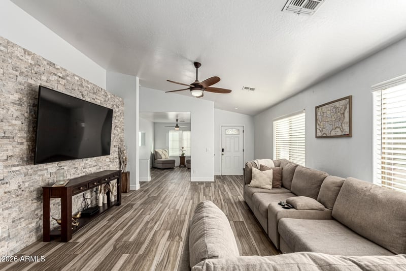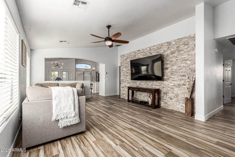 Listing details for 3040 257th Dr, Buckeye, AZ 85326 : Stunningly updated and brimming with modern style, this beautiful home is perfectly situated on a corner in the coveted Westpark neighborhood! Offering nearly 1,600 sq.ft. of thoughtfully designed living space with soaring vaulted ceilings, this residence showcases a meticulous 2020 remodel featuring plank flooring throughout, a custom stone-veneer accent wall in the Living Room, cozy seating area, designer lighting, and beautifully updated bathrooms. The bright, open kitchen is a true showstopper--complete with quartz countertops, crisp cabinetry with sleek hardware, a herringbone-pattern backsplash, black stainless appliances, a farmhouse sink, and a large island with breakfast bar. The split-plan primary suite offers a peaceful retreat with custom wall décor and an en suite bathroom featuring a custom vanity and stylish wall finishes. The leased solar equals energy savings! Step outside to enjoy a relaxing covered patio and a spacious, fully landscaped, low-maintenance backyard with artificial turf. With convenient freeway access, this exceptional home is truly a MUST SEE!