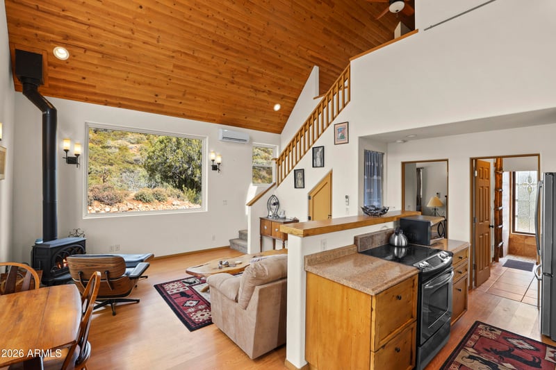 Listing details for 308 Nellie Dr, Payson, AZ 85541 : Rare opportunity to own a chalet styled home bordering National Forest! Enjoy unobstructed views, total privacy, and walking distance to the East Verde River. Your ultimate mountain lifestyle awaits. Remarkable privacy on 1.64 acres with the Tonto National Forest in your backyard. Main bedroom is on lower level with access to back patio and tranquil view of the forest. Walk-in shower, single vanity sink, stacked washer and dryer are in attached bathroom..Kitchen has an electric oven, refrigerator, microwave, real wood cabinets and a built-on dining table that folds against the breakfast bar. Wood stove in Great Room and windows galore for tons of natural light! Sleeping loft has access to a spacious deck to view stars and wildlife. Full bathroom upstairs as well as small built in desk area. Large concrete, wrap around patio for outdoor entertaining and a covered patio in front of the house. There is a small shed, extra parking and RV parking at the base of driveway. Home is being sold turn-key, with exception of a few personal items.