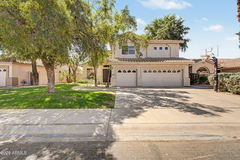 Listing details for 311 Shannon St, Gilbert, AZ 85233 : This stunning 2-story, 4-bed Gilbert home delivers the space and lifestyle buyers are searching for. The 3-car garage, mature shade trees, and lush front lawn make a strong first impression. Inside, soaring vaulted ceilings and wood-look flooring anchor a light-filled living room that flows into the family room with a cozy fireplace. The updated kitchen features quartz counters, white cabinetry with black hardware, a large island with a farmhouse sink and designer pendant lighting, breakfast nook, walk-in pantry, and stainless steel appliances. French doors open to a private den or home office. The spacious primary suite boasts a soaking tub and walk-in closet. Out back, enjoy a covered patio, large grass yard, spa, and hammock area perfect for Arizona evenings. Gilbert living at its best.