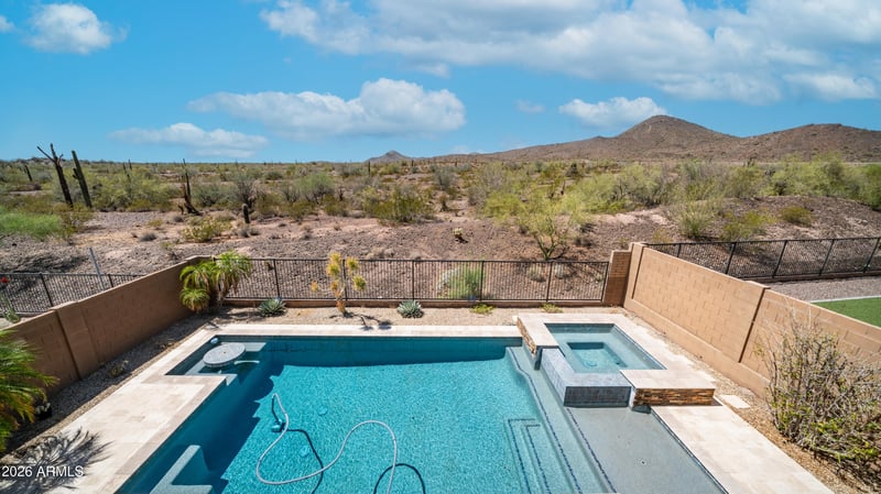 Listing details for 31106 138th Ave, Peoria, AZ 85383 : Luxury Peoria home for sale at 31106 N 138th Ave with 5 bedrooms, 4.5 bathrooms, and mountain views backing to a protected nature preserve with no rear neighbors. Features dual primary suites, including upstairs owner's retreat with private balcony and dual walk-in closets, plus a downstairs suite ideal for guests or multigenerational living. Spacious loft and den offer flexible space for office, gym, or playroom. Resort-style backyard includes saltwater pool, waterfall spa, low-maintenance landscaping, and app-controlled pool automation. Upgrades include new tankless water heater, 3-car garage with epoxy floors, hidden storage, and pre-plumbed sink. Near hiking, biking, parks, and community amenities.