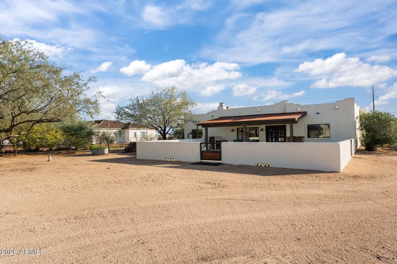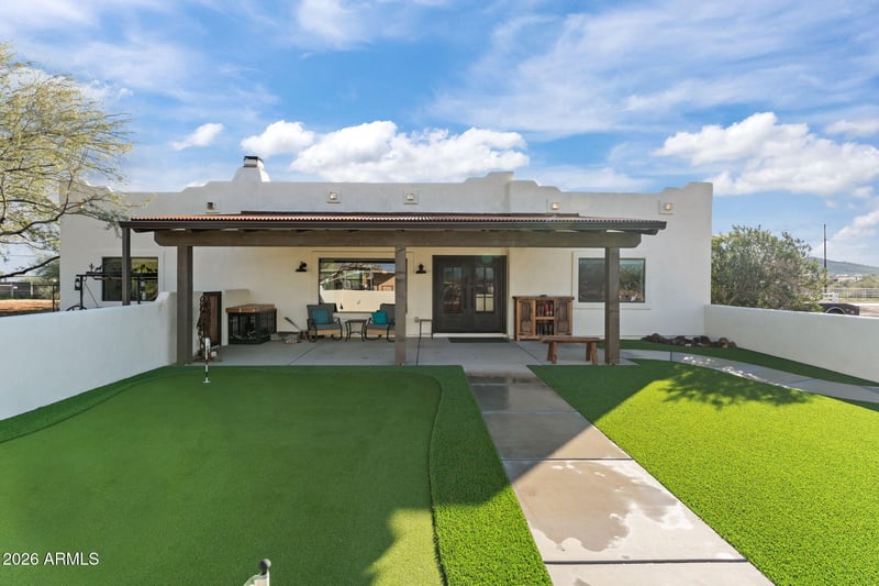 Listing details for 312 Galvin St, Phoenix, AZ 85086 : Located just off a paved road w/ quarter-minus access, this fully improved 4.3-acre horse property offers an exceptional equestrian setup & a beautifully updated home. Mature mesquite trees enhance the setting, w/ select trees on drip irrigation. Property is serviced by City water & septic, & features continuous fencing throughout. Designed for serious horse use includes a lighted 150' x 300' arena, covered boxes, & a chute that conveys w/ electric & compressor. Improvements include a barn W/ 5 pens featuring saddle & tie racks, lighting, feed storage, parking, & turnaround space, plus a 40' x 60' hay shed, hot walker, & multiple pen configurations including (5) 100' x 100' shaded pens,(5) 40' x 60' pens, (3)20' x 40' pens, (3)10' x 60' steer pens w/ feed bunks, a load-out alley w/ pen. The 3-bedroom home was updated in 2025 and features tile flooring, quartz countertops, soft-close cabinets, island kitchen, all new appliances, and a gas fireplace. The primary suite offers a Jacuzzi tub with shower, double sinks, and a walk-in closet. Outdoor living includes new exterior paint, pavers, fire pit, artificial turf, putting green, and a front patio with TV and electric heater. A garage and strong curb appeal complete the package. A rare opportunity to own a turn-key horse property with city water, extensive infrastructure, and a modernized home.