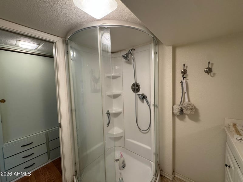 The bathroom includes a walk-in shower along with built-in storage cabinets for added convenience. The covered patio extends your living space with fully tiled flooring, a metal roof, and functional features including a small refrigerator, and outdoor storage. A divider wall at the back enhances privacy while maintaining flexibility of use. A small shed provides additional storage space, making this property a practical choice for low-maintenance living in Florence.
