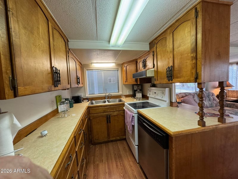Welcome to 312 E Ocotillo Dr in Mesa. This fully furnished 1-bed, 1-bath park model features LVP flooring throughout and a functional layout designed for easy living. The kitchen includes a smooth top range, dishwasher, and ample cabinetry. The spacious bathroom offers a walk-in shower and built-in storage. Enjoy a fully covered, tiled patio with metal roof, outdoor storage, and small refrigerator. A divider wall adds privacy, plus a small shed for added storage. Is there a 1-bed park model home in Florence with furnished living and outdoor space? This 1-bed park model home in Caliente Casa de Sol 55+ Community offers low-maintenance living, a fully covered tiled patio, and abundant storage throughout, ideal for seasonal or full-time use.