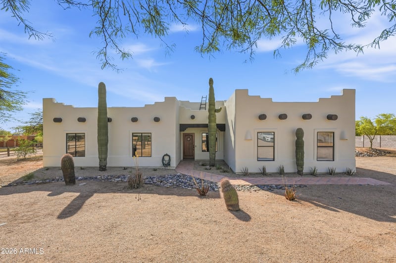 Listing details for 31206 65th St, Cave Creek, AZ 85331 : Private Desert Oasis with Guest House - Beautifully updated 3BR/2.5BA main home plus 2BR/1BA attached guesthouse complete with kitchen and laundry, on a private 1.3-acre desert lot with abundant space for horses, a workshop, or additional garages. Open, airy European-inspired design with 10-ft ceilings and abundant natural light. Gourmet kitchen features a huge island, a 36'' Thor range, new dishwasher, wine/beverage cooler, and butler's pantry. Spacious primary suite offers a new spa-style bath with walk-in shower, soaking tub, double vanity, and smart toilet. Enjoy a resort-style pool, multiple patios, and outdoor living spaces perfect for relaxing or entertaining. Includes a 2-car garage, ample parking for an RV and desert toys, plus a private parking area for the guesthouse. Privacy, guesthouse. Privacyand luxury desert living all minutes from Cave Creek's and Scottsdale's shops and dining.