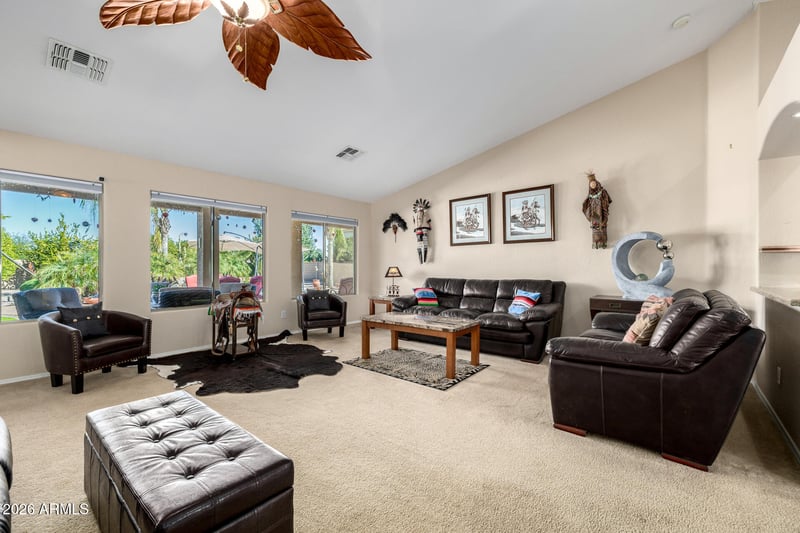 Listing details for 31267 Saddlebag Ln, San Tan Valley, AZ 85143 : Welcome to your private retreat in Johnson Ranch! This well-maintained 3 bed, 2 bath home + a den sits on an expansive 1/3 acre lot and offers exceptional indoor-outdoor living! The resort-style backyard is the true showstopper, featuring a heated pool with a soothing water feature, a hot tub under a pergola, mature citrus trees, and beautiful mountain views, perfect for entertaining or enjoying AZ sunsets. Inside, the remodeled primary bathroom creates a spa-like escape, while 32 solar panels with bird screening help keep energy costs low. Enjoy community features such as acres of greenbelts and recreation, three community pools with spas, tennis, pickleball, basketball and volleyball courts, a catch-and-release pond, pitch and putt golf, disc golf, plenty of parks and more!