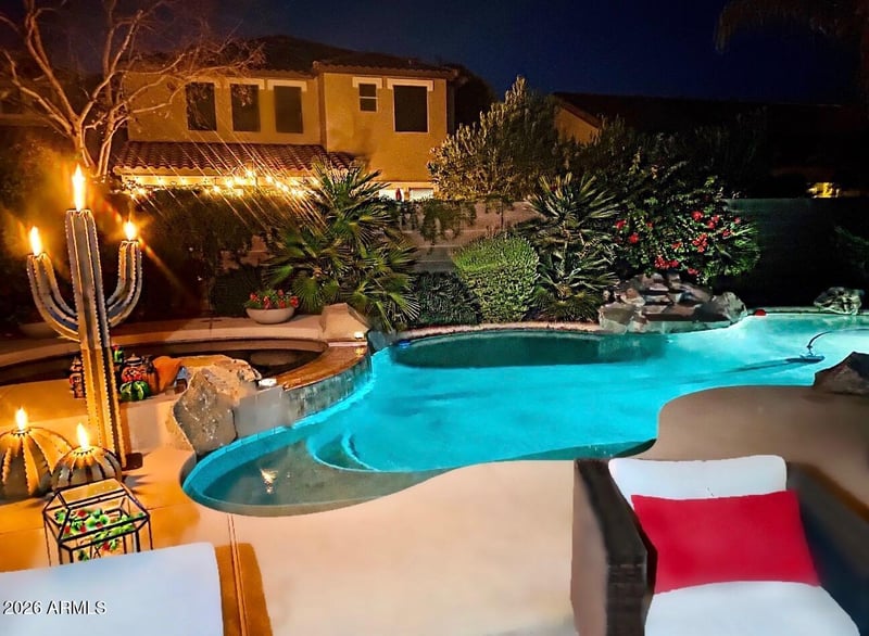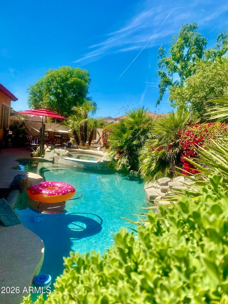 Step outside to your own backyard oasis complete with a sparkling pool, hot tub, and built-in BBQ--perfect for hosting or unwinding in Arizona's beautiful weather. A gated garden entry with a tranquil fountain sets a warm, inviting tone, while the home's location diagonally across from the neighborhood park adds both convenience and charm.