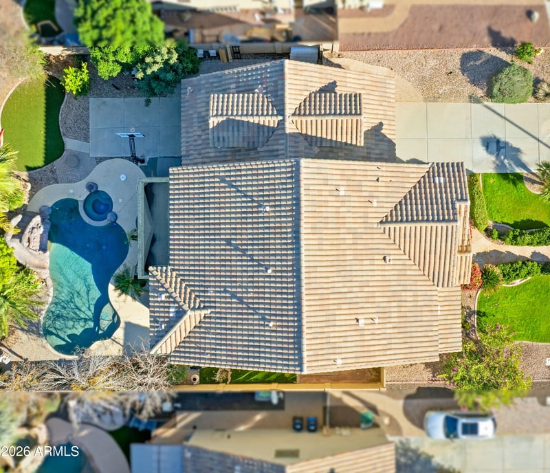 Listing details for 3158 Turnberry Dr, Gilbert, AZ 85298 : Welcome to a residence of timeless architecture and generous living spaces. THOUGHTFULLY DESIGNED, this home is located in a highly desirable Gilbert community near top-rated schools. Architectural details include soaring ceilings at the grand entry, an iron spiral staircase, crown molding, 8-inch baseboards, coffered ceilings and wood flooring throughout key living areas. The first floor features a guest bedroom, while the second level includes the primary suite, an en-suite bedroom, Jack-and-Jill bedrooms, & an expansive bonus room perfect for a home theater, game room, or lounge retreat. Additional features include a surround sound system & wood shutters. The backyard is an entertainer's dream, featuring an 8-foot diving pool with water feature & spa, w/ refinished slide & waterproofed spillway plus a basketball court and rain gutters that complement the home's outdoor design.