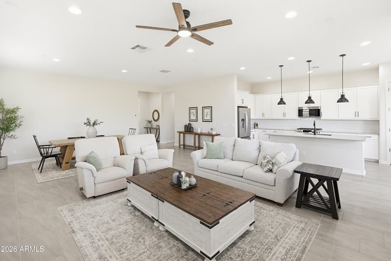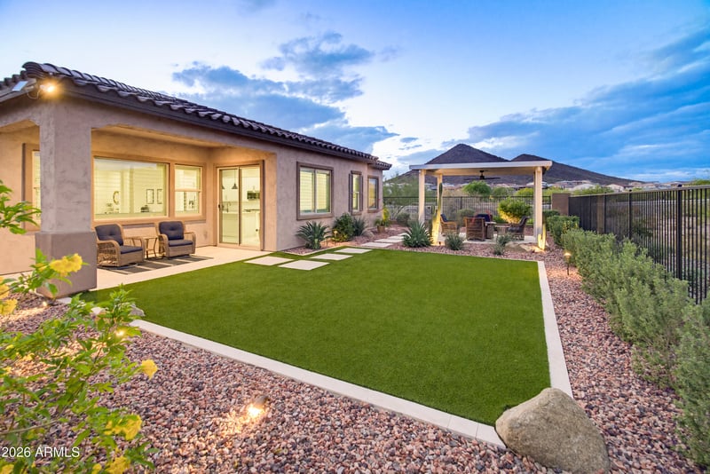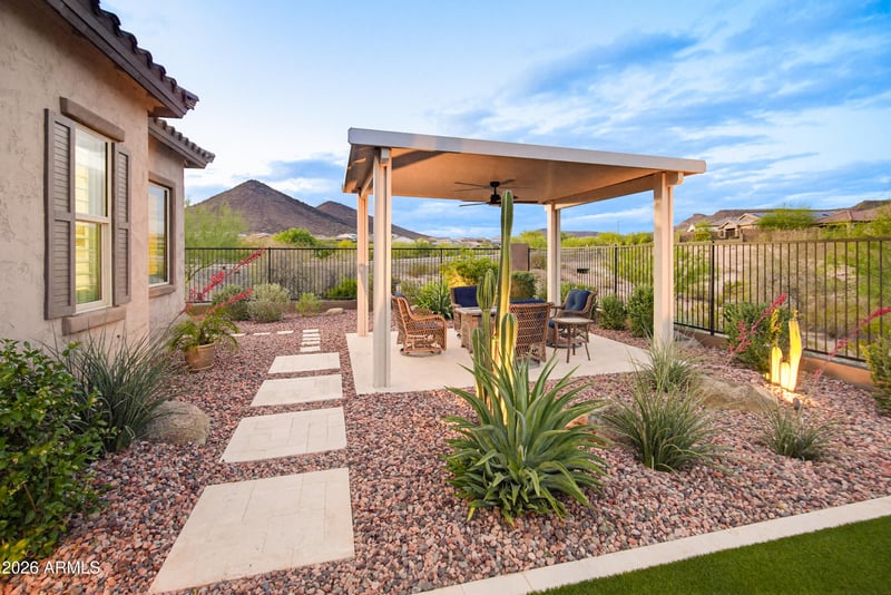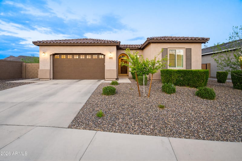 Listing details for 31695 123rd Ln, Peoria, AZ 85383 : Beautiful single-story home featuring 4 bedrooms, 3 bathrooms, and a versatile flex room on a desirable corner lot with view fencing showcasing stunning mountain views while maintaining privacy. A charming front courtyard welcomes you into the open-concept layout designed for easy living and entertaining. The chef's kitchen offers white cabinetry, stainless steel appliances, gas double ovens, stylish backsplash, and generous prep space. Tile flooring runs throughout the main areas with shutters on every window. The private owner's suite features dual sinks and a spacious walk-in shower, while secondary bedrooms include a flex space ideal for guests or multigenerational living. Enjoy your own private backyard oasis with travertine pavers, turf, pergola, and low-maintenance desert landscaping. Complete with a 3-car garage for added storage and convenience.