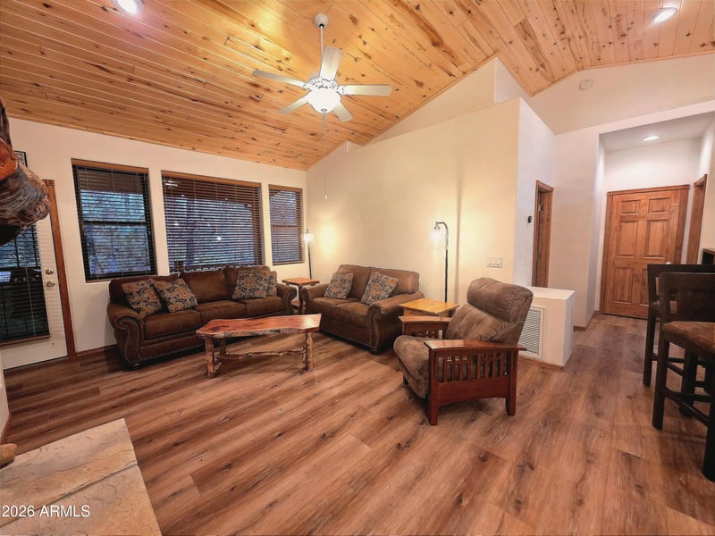 Listing details for 3170 Lodgepole Ln, Show Low, AZ 85901 : Tucked away in the sought-after Cardinal Landing at Torreon, this charming 2-bedroom, 2-bathroom home offers effortless mountain living with thoughtful updates throughout. From the moment you arrive, the covered front patio welcomes you in, setting the tone for a home designed to be both comfortable and low-maintenance. Inside, updated vinyl plank flooring flows seamlessly through the living spaces, creating a warm and cohesive feel, while granite countertops add a timeless touch to the kitchen. The open layout allows natural light to fill the home, making it equally suited for quiet mornings or relaxed gatherings with friends and family. An attached two-car garage provides convenience and additional storage, perfect for mountain living. Out back, a covered READ MORE!!!!