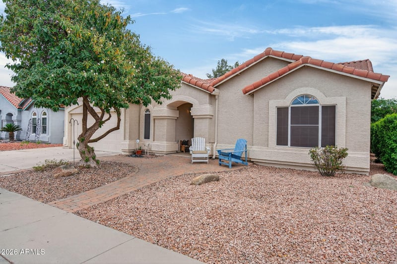 Listing details for 3171 Frankfurt Dr, Chandler, AZ 85226 : Located in Chandler's 85226 zip code, this 4-bedroom, 2-bath home features vaulted ceilings, arched architectural details, and a functional floor plan. The main living area offers tile flooring and an open layout with direct access to the backyard. The dining room features newer vinyl flooring, which continues through the hallways and walkways. The kitchen connects seamlessly to the living and dining spaces and includes a breakfast bar, ample cabinet storage, generous counter space, pantry, and an eat-in area with sliding glass doors. The primary suite is spacious with backyard access and an en-suite bath featuring dual sinks, a soaking tub, and separate shower. Secondary bedrooms are well-sized with carpet floorings. The backyard includes a covered patio, mature trees and bushes, and space to personalize. Conveniently located near parks, shopping, dining, and freeway access.