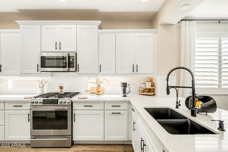 Listing details for 32062 124th Dr, Peoria, AZ 85383 : Seller will contribute up to $10k for interest rate buydown for a rate UNDER 5%. Save up to $460 per month! This beautifully designed Lily plan combines modern finishes, thoughtful custom touches, and premium builder upgrades, creating a home that feels truly elevated from the moment you arrive. Set behind an elegant iron front door, the interior unfolds with smooth-finish drywall, squared corners, tall 8' doors, and upgraded 5'' baseboards, giving every space a fresh, contemporary look. The main living areas feature gorgeous LVP flooring that flows throughout the home, while the utility room and hall bath showcase custom octagon tile for added character. Wood-tilted shutters dress every window, and upgraded lighting—inside and out—enhances the home's warm, inviting ambiance. The heart of the home is the gourmet kitchen, where extended soft-closing cabinetry, under-cabinet lighting, kitchen windows above the counters, quartz countertops, a custom tile backsplash, and black hardware come together in a crisp, modern aesthetic. A 10' multi-slide patio door floods the space with natural light and opens to the extended outdoor living areaperfect for entertaining. The primary suite is a peaceful retreat with a tray ceiling and spa-inspired bath featuring a quartz vanity, square under-mount sinks, custom framed mirrors, and a beautifully tiled super shower. Additional bedrooms include custom wood feature walls, giving each room its own designer touch. Functionality shines throughout the home with a truly oversized multipurpose laundry/utility room offering custom cabinetry, working countertop, and a built-in washer/dryer area. Additional upgrades include an RO system, soft water system, pre-wire for surround sound, and custom garage storage with doors. The epoxy-coated garage also includes a utility door and a 220V outlet for car charging. Step outside to a private yard designed for low-maintenance living, complete with two outdoor storage sheds, a gated turf dog run, and an extended covered patio. Upgraded front yard landscaping and the home's Tuscan elevation add to the impressive curb appeal.