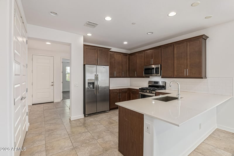 Listing details for 32081 125th Ln, Peoria, AZ 85383 : LIKE NEW with PREMIUM VIEW LOT! Built in 2022, this nicely upgraded 1-STORY home offers the PRIVACY AND OPEN VIEWS buyers crave -- with ONLY ONE NEIGHBOR. Situated on a premium lot with VIEW FENCING, this well-maintained home BACKS TO A DESERT COMMON AREA and SIDES TO A NATURAL WASH with WALKING PATH, meaning no neighbors directly to the left and none directly behind. Enjoy wide-open desert views and incredible privacy that's hard to find at this price point. Featuring 5 BEDROOMS, 3 FULL BATHS and a desirable SPLIT FLOORPLAN, this home offers space and FLEXIBILITY FOR MULTI-GENERATIONAL LIVING, guests, or work-from-home setups. The MODERN KITCHEN Showcases: • Stainless steel appliances • Gas stove • Refrigerator included • White quartz countertops • White subway tile backsplash " Rich java cabinets with stainless hardware " Single-basin ceramic sink PRIMARY EN-SUITE: " En-suite bath with white subway tile surround shower Additional Upgrades: " Ceiling fans in all rooms " Tankless water heater " Security system " Water leak sensor " Landscape timer system Step outside to a low-maintenance EAST-FACING backyard with xeriscape landscaping and ARTIFICIAL TURF -- perfect for enjoying open views without the upkeep and without direct hot west sun. At $515K, this is an incredible opportunity to own a nearly new, move-in-ready home on ONE OF THE BEST LOTS in the community. Privacy. Views. Modern finishes. Value. Abutting the award-winning community of Vistancia, this beautiful community has incredible rolling hills, desert landscape & hiking trails along with close proximity to the future 320-acre 5 North at Vistancia commercial core that is home to the new ALA K-12 charter school.