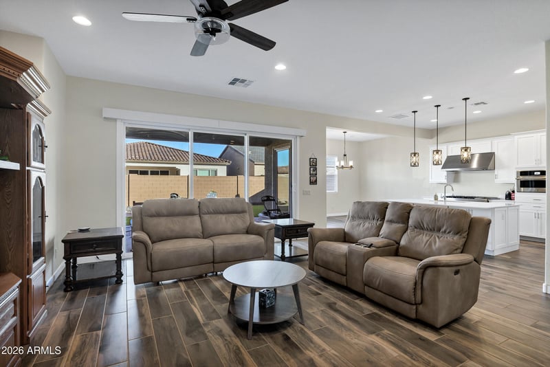 Listing details for 3228 Saddletree Way, San Tan Valley, AZ 85140 : ATTACHED CASITA / NEXTGEN LIVING - This newly built home offers 3,025 square feet of flexible living space and a private attached casita with its own entrance and backyard access. The main home features 3 bedrooms, 2 full bathrooms, and a dedicated office space all designed around an open, light-filled floor plan. Wood-look tile flooring, recessed lighting, and oversized sliding glass doors with electric shades create a seamless flow between indoor and outdoor living. At the heart of the home is a chef's kitchen built to impress, anchored by a professional 8-burner gas range with split oven, stainless steel hood, quartz countertops, custom cabinetry, a large center island, wine fridge, and premium stainless steel appliances. The primary suite offers a spacious retreat with a modern en-suite bathroom featuring dual vanities, a large walk-in shower, and generous closet space. Step outside to a low-maintenance backyard with paver patio and artificial turf perfect for relaxing, entertaining, or enjoying Arizona evenings without the upkeep. The attached casita offers a full kitchen, living space, bedroom, full bathroom, and laundry. A perfect fit for buyers seeking space, functionality, and high-end finishes all on a single level. Wales Ranch is a gorgeous new build community that offers pickleball courts, basketball courts, a lake, and many other accommodations!