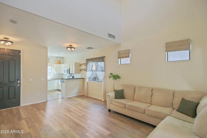 Listing details for 323 Travis --, Mesa, AZ 85208 : Welcome to your Move-In Ready, gorgeous home in the highly desirable Sienna Estates. Numerous upgrades include: beautiful pavers, palm trees, agave plants and updated landscaping out front, putting green located on the side yard, large covered patio and artificial turf in backyard. New light fixtures, window coverings and faucets throughout the home. Elegant hardware on kitchen cabinets with new farm sink, stainless steel appliances, new shelves and backsplash. All appliances stay with the home. Other upgrades include: flooring, new and modern staircase railing, two new bathroom vanities, new shower head and modern medicine cabinet. New interior paint with amble natural light for a lighter feel. Both bedrooms have large walk-in closets, nook in hallway is perfect for an office.