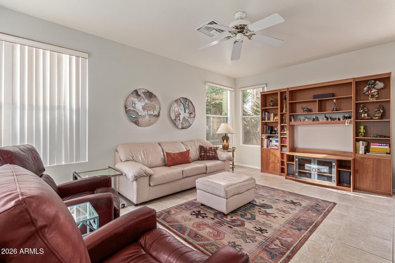 Listing details for 3231 Northern Cross Trl, Tucson, AZ 85742 : Mountain View Living! This light-filled home in Tucson, offers a thoughtful layout with generous living spaces & modern updates throughout. A large formal living & dining area creates a central space & seamless flow through the home. The family room connects to the updated kitchen, featuring sleek white cabinetry, SS appliances, quartz countertops, breakfast bar & pantry, plus a built-in desk for work or everyday organization. The spacious primary includes a glass slider with backyard access & remodeled ensuite with dual vanity, walk-in shower & walk-in closet. The other updated full bath serves the secondary bedroom, while a separate den/office with French doors offers the flexibility to convert into a 3rd bedroom, guest suite or workspace. High ceilings & expansive windows throughout provide abundant natural light. Outside, enjoy a covered patio, mountain views & low-maintenance desert landscaping with room to customize. Additional updates include new whole house plumbing with no polybutylene piping, a new A/C & a new hot water heater. Community amenities include a pool, spa, tennis & pickleball courts, for a low HOA monthly fee, all conveniently located near Marana Unified School District, Tucson National Golf Course, shopping & dining.