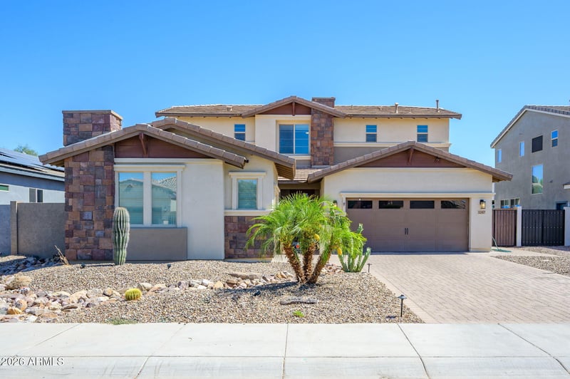 Listing details for 3247 Creosote Ln, Gilbert, AZ 85298 : Open-concept main floor; chef-inspired kitchen w/quartz countertops, premium s/s appliances & oversized island. Main level den/bonus room. Downstairs bedroom & full bath add versatility for multigenerational living. Expansive windows & sliding doors bathe interiors w/natural light, highlighting the home's contemporary aesthetic. 4 generously sized bdrms up, luxurious primary suite, flexible loft space as well. Thoughtfully designed backyard oasis w/low-maintenance, drought-tolerant landscaping & intentionally selected plants that will not shed leaves into the HEATED & CHILLED pool. Baja step. Expansive paver decking creates plenty of entertaining space. Cat 4 & surround sound. Premium Lot w/water view 60K spent on pool and heater. Tankless hot H2O htr. Basketball & volleyball nearby.