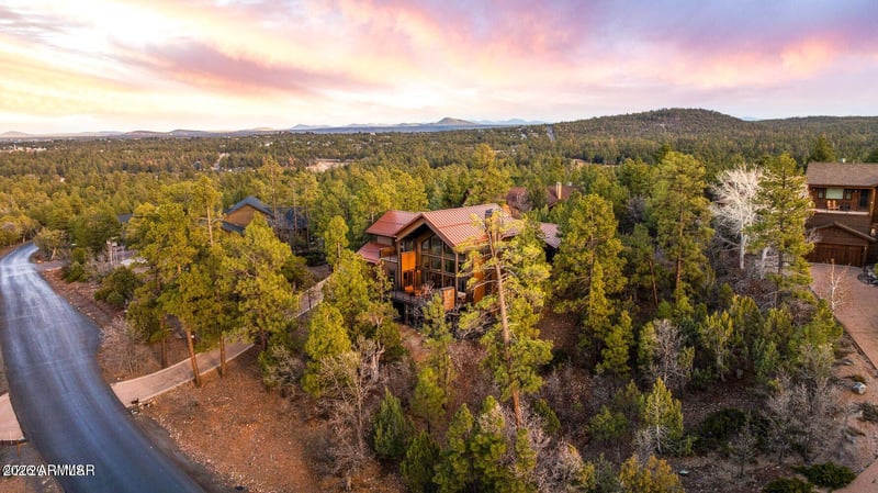 Listing details for 3281 Falling Leaf Rd, Show Low, AZ 85901 : Tucked high among the Ponderosa pines in Torreon, this thoughtfully designed mountain retreat feels like your own modern treehouse in the treetops. Renovated inside and out in 2020, the home blends timeless mountain charm with luxury comfort and cutting-edge technology. The main-level primary suite offers easy, single-level living and a peaceful escape, complete with a private exit onto the front deck, where you can step outside and take in the fresh mountain air and watch breathtaking monsoon storms roll through the forest. At the heart of the home, the elevated kitchen was intentionally designed to frame stunning views through the front windows, allowing you to admire the scenery while cooking, gathering, and entertaining. Flowing into open living spaces and out to the expansive deck, every detail invites connection and relaxation. Enjoy cozy evenings by one of two fireplaces, unwind beneath the stars, and experience unforgettable sunsets and stormy summer skies from your front-row seat in the pines.