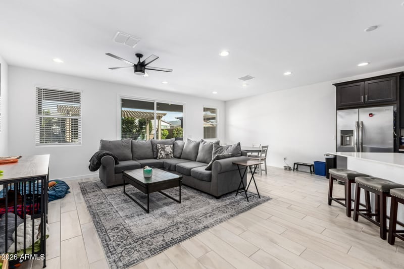 Listing details for 3318 Hayfield Way, San Tan Valley, AZ 85140 : Discover all the charm of this lovely single-story home with a welcoming curb appeal and a 2-car garage. The interior boasts bright and spacious living areas with tile flooring, contemporary lighting, tons of natural light, and a neutral palette. Whip up your signature dishes in the open-concept kitchen, equipped with espresso shaker cabinets, quartz countertops, stainless steel essentials, and an island, perfect for casual meals. The main bedroom is a true retreat, complete with a private bathroom with double sinks for added convenience. The den is perfect for a gaming zone or an office. Out back, you'll have a covered patio where you can unwind after a long day, artificial grass, and a seating area with a pergola, perfect for gatherings. What's not to love? Check it out now!