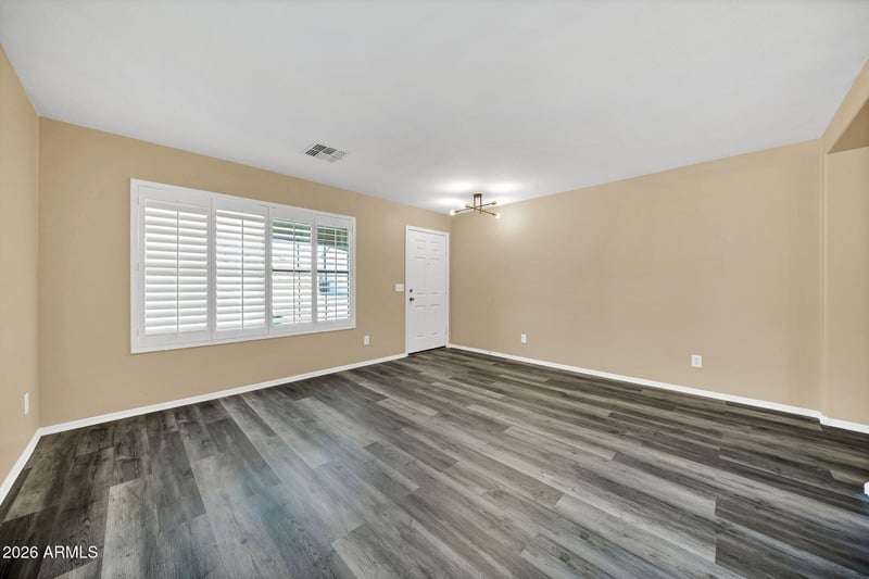 Listing details for 3323 Saint Anne Ave, Phoenix, AZ 85041 : Located in the Southern Views community of Laveen Village, this 1,759-square-foot Territorial-style home built in 2006 features three bedrooms, two bathrooms, and a two-car garage. The single-story interior boasts a split master suite with a walk-in closet and a separate tub and shower, alongside a functional kitchen equipped with a gas range and an eat-in dining area. Modern wood-look flooring flows through the living spaces, while plantation shutters and a spacious walk-in pantry add both style and utility. Outside, the 5,500-square-foot lot includes a covered patio and low-maintenance desert landscaping, all situated within the Roosevelt Elementary and Phoenix Union High School districts.