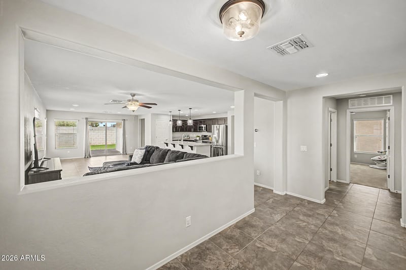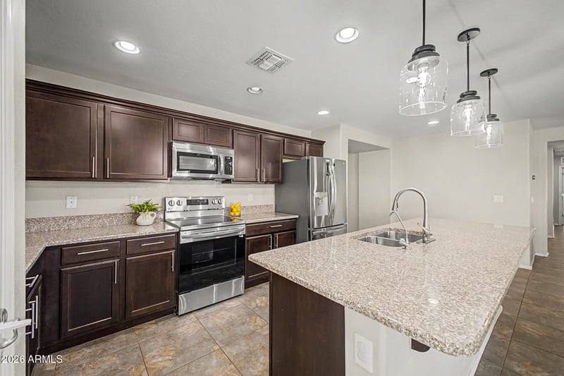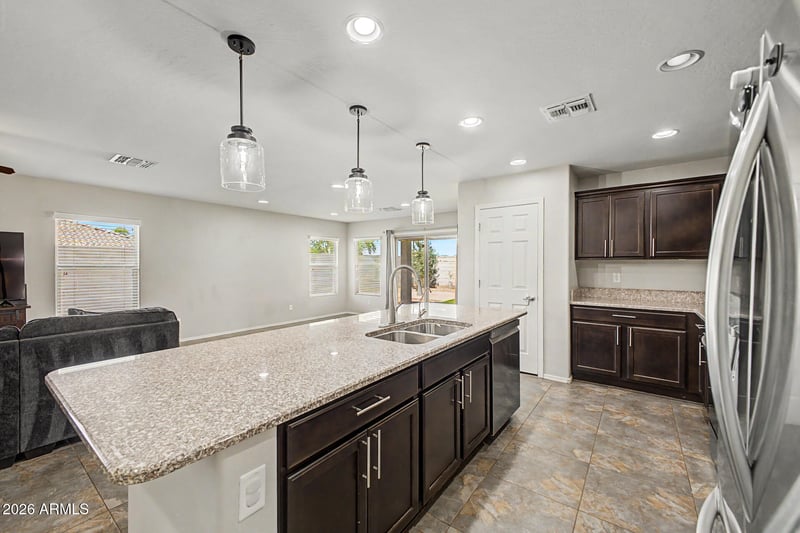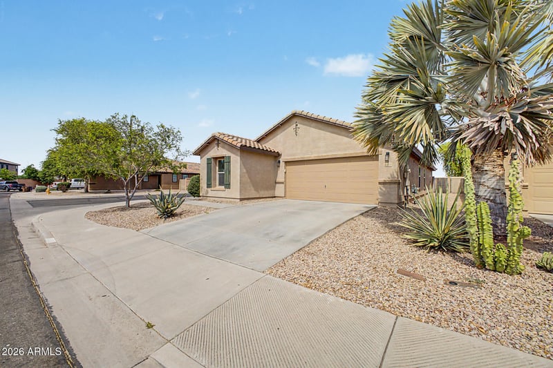 Listing details for 33421 Bowles Dr, San Tan Valley, AZ 85144 : Welcome to your new 3 bedroom, 2 bathroom home with a versatile flex space--perfect for a home office, gym, or kids' playroom nestled in the heart of San Tan Heights. This thoughtfully designed single-level layout centers around a beautiful kitchen, featuring stainless steel appliances, granite countertops, a spacious island, and elegant cabinetry, making it the true heart of the home. Situated on a desirable corner lot, the property also boasts a large backyard complete with turf and pavers, offering a low-maintenance outdoor space ideal for relaxing or entertaining.