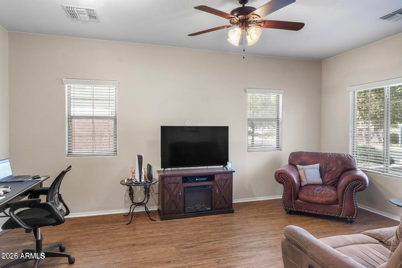 Listing details for 3417 131st Ln, Litchfield Park, AZ 85340 : Former model home, beautifully upgraded and meticulously maintained. This 3 bed, 2 bath home offers 1,885 sq ft of open living space with a spacious family room and custom 18-inch tile in high-traffic areas. The large kitchen features a center island with breakfast bar, upgraded cabinets, pantry, newer stainless steel appliances, and RO system. The primary suite includes a separate exit, dual sinks, separate tub and shower, and a custom walk-in closet. Newer Trane 18 SEER HVAC with transferable warranty and new 50-gallon water heater. Extended garage with coated floor, 12-ft RV gate, and oversized side yard. Professionally landscaped front and back with firepit and 6-zone irrigation. Close to schools, shopping, and easy access to I-10 and 101.
