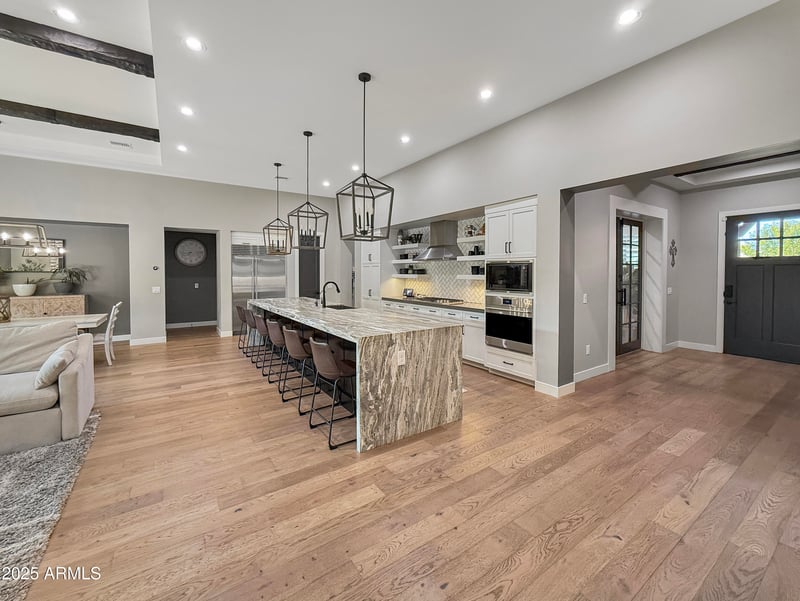 The chef's kitchen is a true showstopper, centered around an oversized 16' MATTE MARBLE WATERFALL ISLAND, BLACK FIXTURES, and a HERRINGBONE SUBWAY TILE BACKSPLASH. Premium WOLF AND SUB-ZERO APPLIANCES, a 48" COMMERCIAL GAS COOKTOP WITH MATCHING HOOD, custom SLOW-CLOSE CABINETRY WITH PULL-OUTS, and a WALK-IN PANTRY WITH COFFEE BAR complete this thoughtfully designed space.