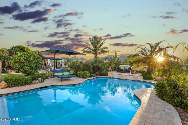 Listing details for 34224 Paseo Grande Dr, Queen Creek, AZ 85144 : Located in the exclusive gated community of Encanto Paseo and set on an expansive 1.33-acre lot, this property offers exceptional privacy, breathtaking San Tan Mountain views, sparkling city light views, and the peaceful beauty of the surrounding desert landscape, all framed by the dramatic backdrop of San Tan Regional Park.