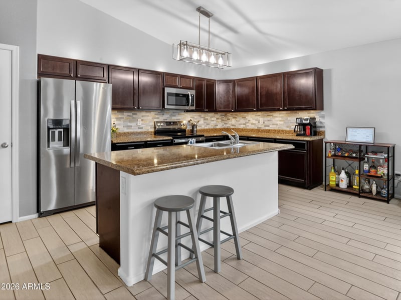 Low-maintenance backyard with covered patio, pavers, and fire pit, perfect for entertaining. Conveniently located near parks, greenbelts, Loop 202 & I-10 for easy commuting.