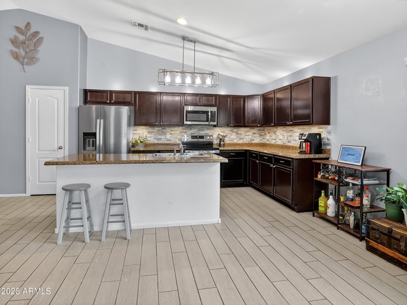 Bright open layout with 12-ft vaulted ceilings, upgraded tile in main living areas, and carpet in bedrooms only. Spacious kitchen with newer stainless steel appliances, pantry, and island with breakfast bar.