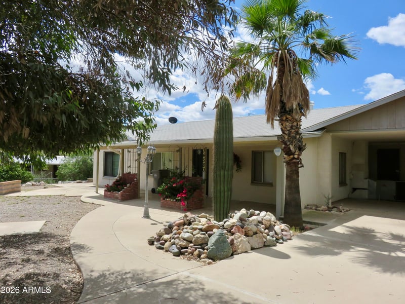 The kitchen includes an island breakfast bar and overlooks the main living areas. Exterior amenities include a carport along with an attached one-car garage, offering ample parking, the home needs updating, making it a fantastic opportunity for buyers looking to personalize or invest. Step outside to a lovely, fully fenced yard highlighted by numerous mature citrus trees and over six impressive saguaro cacti, creating a true Arizona desert oasis with privacy and character.
