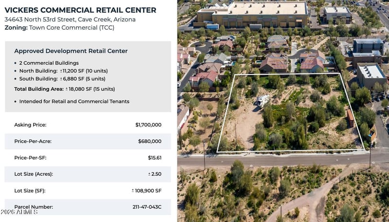 Listing details for 34643 53rd St #-, Cave Creek, AZ 85331 : The Vickers Commercial Retail Center is an approved retail development located at 34643 North 53rd Street in Cave Creek, Arizona. The project