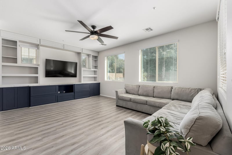 Listing details for 3469 Indigo St, Gilbert, AZ 85298 : A must-see opportunity in one of Gilbert's most sought-after neighborhoods! This beautifully maintained home welcomes you with a bright, designer kitchen that opens seamlessly to a spacious great room featuring a custom built-in entertainment center--perfect for everyday living and entertaining. The main level also offers a versatile guest suite or den along with a full bathroom, ideal for visitors or multi-generational living. Step outside to your private backyard oasis, complete with a covered patio, low-maintenance artificial turf, and a stunning crystal-blue pool--perfect for relaxing or hosting gatherings year-round. Upstairs, enjoy a thoughtfully designed layout featuring a generous loft with built-in desk space, elegant white quartz countertops, and custom wall cabinetry. The expansive primary suite boasts additional custom cabinetry, accompanied by two secondary bedrooms and a full bath. Located in The Bridges community, residents enjoy access to beautiful parks, lakes, splash pads, and scenic walking paths. Conveniently close to Gilbert Regional Park, shopping, dining, and top local amenities, this vibrant neighborhood offers something for everyone. Don't miss out on Shea Homes Most Popular two story home!!!