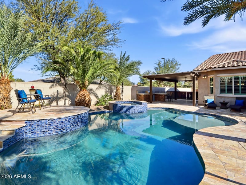 Listing details for 3472 Pinnacle Dr, Chandler, AZ 85286 : Luxurious Executive Home in the Gated Layton Lakes community of S Chandler. This extraordinary property feels like home from the welcoming front patio to the private backyard oasis. Designed for entertaining, it offers large open-concept indoor living & multiple outdoor spaces for pool parties, relaxing on the sun deck, BBQs with friends, or quiet dinners under the covered patio. Inside, the stunning chef's kitchen & great room with a dramatic 12-foot coffered ceiling create a seamless space for everyday living. Over $400,000 combined in designer upgrades elevate the home beyond model finishes, including decorator lighting, crown molding, custom woodworking & feature walls throughout. The private primary suite is thoughtfully separated from the rest of the home, offering a serene retreat with a separate keyed entry/exit. A spectacular chandelier leads into the spa-inspired ensuite bath featuring a floor-to-ceiling tiled walk-in shower with bench seating, soaking tub, dual vanities, and two spacious walk-in closets. The suite also offers direct access to the adjacent laundry room for added convenience. The oversized bedroom includes a sitting area & charming window seat- the perfect place to enjoy morning sunshine. A junior suite at the front of the home offers ideal guest accommodations or a secondary primary option, positioned next to a large bonus/flex room. On the opposite wing, two additional bedrooms are tucked away near the kitchen with a shared adjoining bath. The Living Space also include a a double-door den off the entry, powder bath and wonderful drop zone at garage entry. This Home has so many extras including 3 car tandem with EV Charging, Soft Water System, Hanging Storage, Built-in Storage Cabinetry PLUS a Separate Outdoor Pad for RV/UTV Parking. Located minutes from the Loop 202 near Downtown Chandler & Gilbert dining and entertainment. Layton Lakes Features Lakes, Streams, waterfalls, equestrian trails, basketball & softball fields, tot lots, BBQ areas, splash park, basketball and lighted tennis courts. A rare, move-in ready opportunity in one of Chandler's most desirable gated communities.