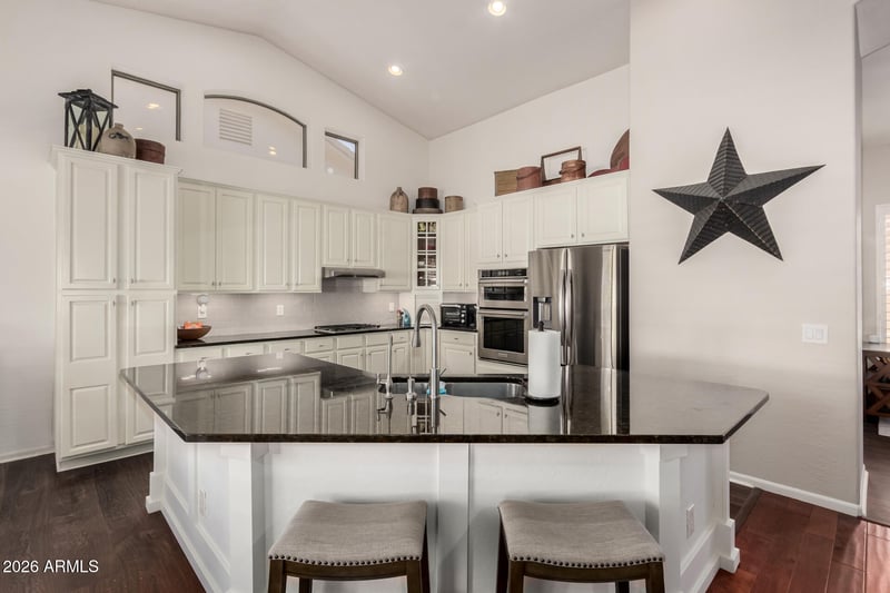 Listing details for 350 Vinedo Ln, Tempe, AZ 85284 : Welcome to this stunning 4 bedroom, 3 1/2 bathroom home in the gated, tree lined streets, of this Alisanos neighborhood. This beautiful residence boasts a spacious office with a queen-size Murphy bed, and a luxurious family room featuring a cozy gas fireplace. The gourmet kitchen is a chef's dream, complete with high-end stainless steel appliances, including a Wolf gas cooktop, a KitchenAid microwave-oven combo, and a Samsung refrigerator. The home also features a three-car garage with a epoxy floor and smart garage door openers. The downstairs features another 2 bedrooms with a full bathroom and living area.