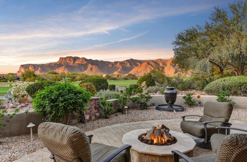 incredible unobstructed views of the Superstition Mountains over 2 fairways of the Lost Gold course. Upgraded Viking appliances, exquisite true craftsman custom cabinetry t/o, light-colored granite counters t/o, designer lighting, ceilings vary from 10' to 19.5' with no two ceilings the same--tongue & grove to wood beams to coffered. Flooring is either wood or travertine. Separate complete guest casita. Heated pool & spa. Gated Lyle Anderson Community w/36 holes of Nicklaus-designed golf. Entire exterior newly painted. Quiet cul-de-sac and no traffic-secluded. All travertine flooring in the home is chiseled edge, all interior doors are 8' solid core, with Emtec hardware; whole house central vac, and stone showers. All bedrooms have ensuite baths with granite counters; all have walk-in closets with buildouts, and ceilings 10' or higher. Clerestory windows provide accents. A delightful sitting area graces the end of a hallway with a lighted art niche. The gourmet kitchen features granite on counters, backsplash, and a large kitchen island with sink. Double wall Viking thermal convention ovens, Viking 6 burner gas cook top with griddle. Side by side stainless 50" Viking refrigerator/freezer. Two brand new dishwashers. The highest quality custom made cabinetry is throughout the entire home. Breakfast bar and a kitchen breakfast nook with wonderful mountain views. Pass through to patio over the kitchen counter to bar style eating on the back patio through a disappearing wall of glass. A walk-in pantry has granite, travertine and a key-drop. Generous formal dining room, 17' x 14', opens to the pool patio, has a coffered ceiling, large buffet server and an entire wall to wall granite countertop as a butler's workstation featuring fine cabinetry and an under counter refrigerator with matching front, and a sink. A separate wine cellar opens to the dining room. Oversized covered back patio is home to a large built-in gas BBQ, cozy fireplace, fountain, and resort style 5 conversation areas, and an enchanting gas fire pit seating area to enjoy the evening sunset glow on the face of the mountain. The great room's stage is set with the 19.5' vaulted ceiling accented by wood beams and an attractive tongue and grove application. 12' tall sliding glass doors 18' feet wide telescope in the wall allowing (as needed) allowing the back patio and the great room to be joined 'as one.' The architect's grand patio cover design perfectly framed the iconic Flat Iron and mast head of the storied mountain. A stately Cantera stone gas fireplace compliments the ambiance of this lovely and comfortable area perfect for family gatherings. A unique coffered ceiling, plantation shutters, and wood flooring create the ideal atmosphere for the polished office, 12' x 11.5', perfect for any executive, which has views of the central pool patio. The grand primary suite has 12' ceilings, wood floors, stunning mountain views, a Cantera fireplace, an exit to a patio, and an extra-large closet with a complete, attractive custom build out. A bar area with granite counters, sink, and refrigerator. A smaller office compliments the primary suite. The bath ensemble has travertine flooring, separate sinks, granite counters, exit to pool, jetted tub, bidet, 2 water closets, snail shower. Split plan bedrooms 1 and 2, from primary suite, have wood flooring, walk-in closets with built-ins and ensuite baths. Bedroom 1 serves as a junior primary with double sinks, large stone shower and a jetted tub. A designer inspired powder room graces the hallway. Upgraded lighting throughout. The resort style large pool terrace separates the main home from the casita. Heated Pebble Tec pool with 6 fountains and a spillover from the heated spa into the pool. The pool area is located on the south side of the main home for winter sun, ideal for winter visitors, and privacy from the golf course. The complete laundry has numerous cabinets, travertine counters, sink, and a built-in ironing board. Garages are oversized with 2 of the bays are as long as 26.5 and 28' long, epoxy floors, abundant storage cabinets and a sink. Gold Canyon is Arizona's best kept secret. Superstition Mountain is the only 36-hole private golf club in all central Arizona, with a limited membership, allowing one of the lowest golfer to course ratios to be found. The golf club has hosted 8 nationally televised tournaments on the LPGA and Champions Tours. The community is only 35 minutes from Sky Harbor and 20 minutes to Mesa Gateway. Only one traffic light separates the members form the Atlantic and Pacific Oceans. Where Else? Nowhere else but here!