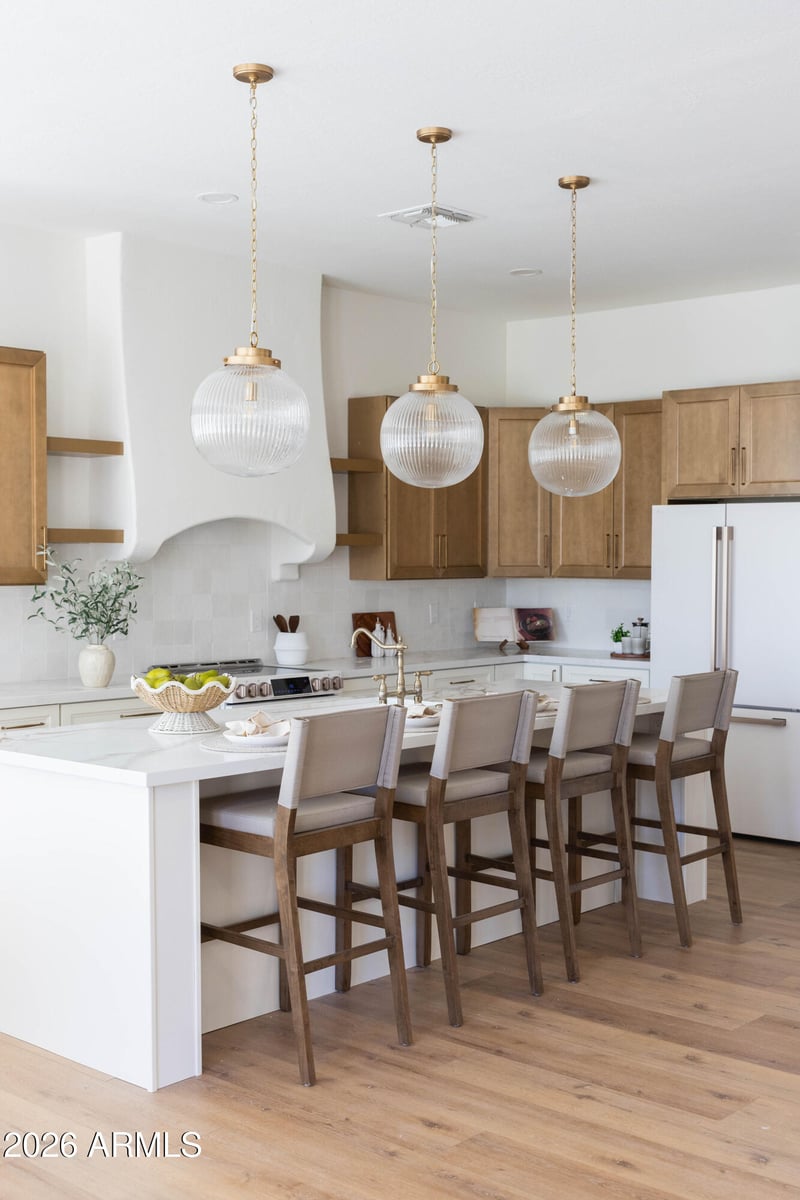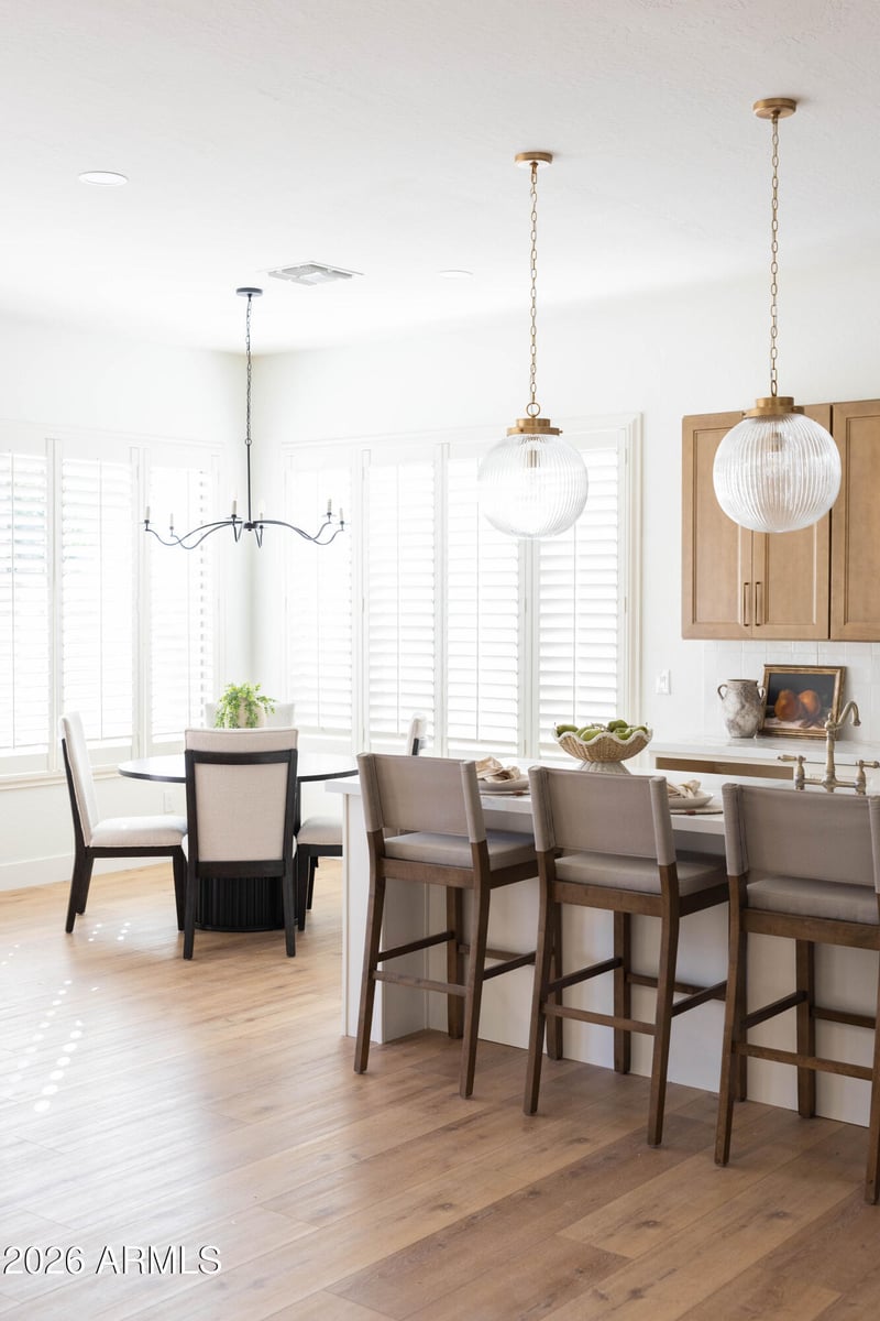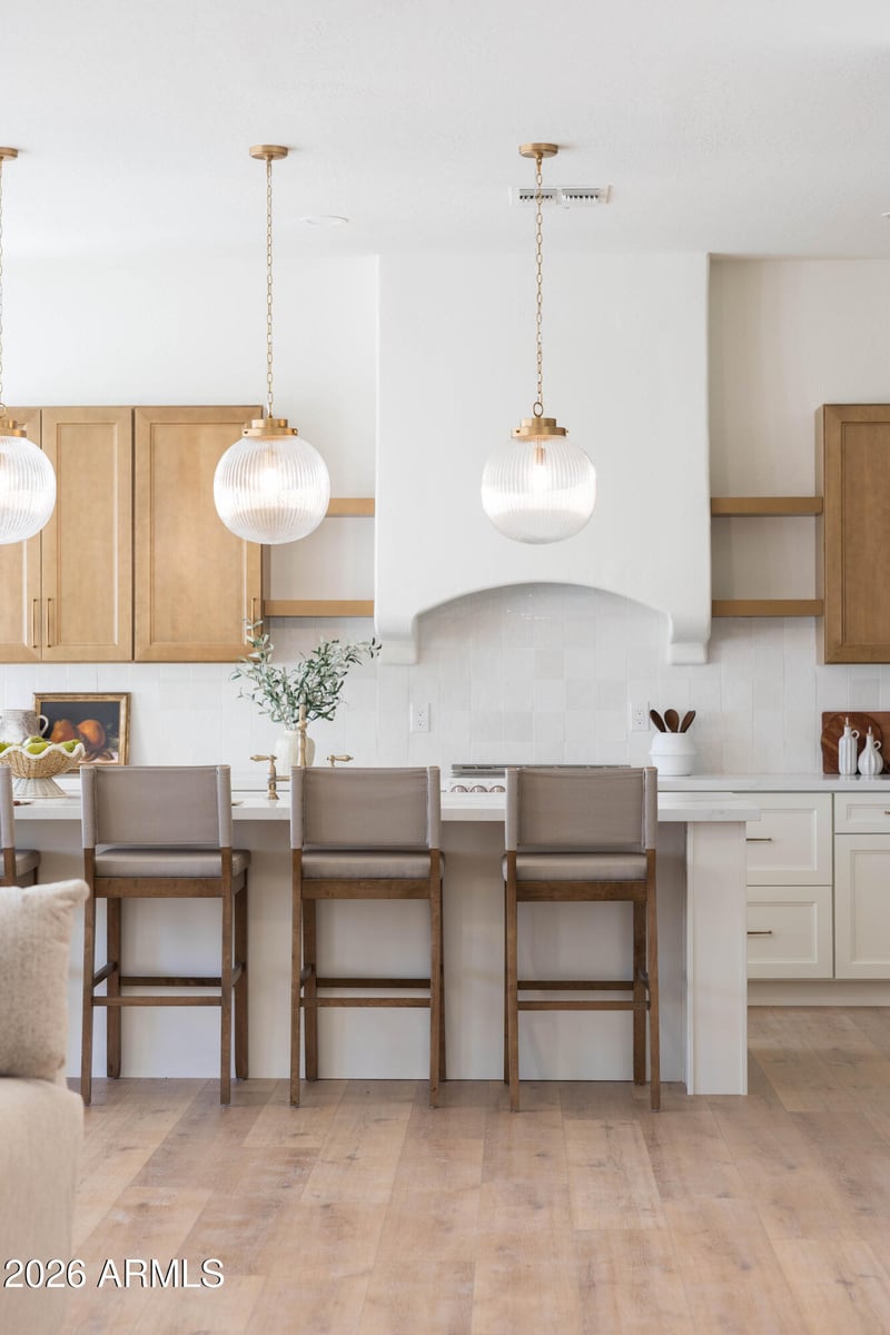 Listing details for 3519 Bridgeport Pw, Gilbert, AZ 85295 : Welcome to 3519 E Bridgeport Pkwy, a thoughtfully remodeled home where elevated design meets everyday comfort in a prime location. The home features new cabinetry w/ brass hardware, designer tile backsplash, statement lighting, & new wood-look flooring throughout. Abundant windows fill the space w/ natural light, creating bright, airy interiors. The kitchen balances style & function w/ custom cabinetry, curated finishes, and designer lighting. The primary suite offers a spacious, private retreat! The bathroom includes a huge shower w/ floor-to-ceiling tile & waterfall shower head, walk-in closet, private toilet room, & an attached den w/ an additional walk-in closet that can serve as a home office, gym, or flexible space. Bathrooms continue the design-forward aesthetic, with the guest bathroom featuring a custom vanity paired w/ checkered tile & exposed brass plumbing. The en-suite guest bedroom offers added privacy w/ its own connected bath, complete w/ designer pendant lighting & a beautifully tiled shower. Meant for Arizona living, the backyard has an extended covered patio, brand new turf w/ putting green, & a pool w/ spa. Can't forget about the 3 car garage!