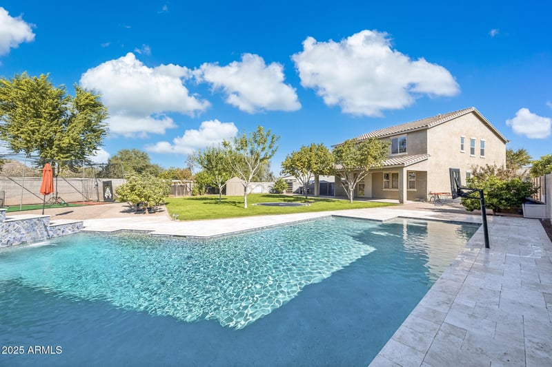 Listing details for 35362 Kelsee Dr, San Tan Valley, AZ 85144 : Welcome to this beautifully updated 4-bed, 2.5-bath pool home in the Morning Sun Farms community, featuring a downstairs office that can easily be converted into a 5th bedroom. The open layout is ideal for modern living, with a gourmet kitchen offering dark cabinetry, stainless steel appliances, a spacious walk-in pantry, and a large island overlooking the great room and dining area. Upstairs offers a loft and a spacious primary suite with dual vanities and walk-in closet. Step outside to an oversized lot with a sparkling pool, extended patio, mature fruit trees, RV gate, and plenty of space to play or entertain. Updates: Pool, pavers/backyard grass (2022), front pavers/driveway extension (2023), board and batten (2024), backyard final step-up pavers/batting cage (2025.)