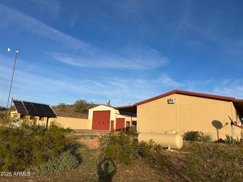 Listing details for 35439 Carefree Hw, Wickenburg, AZ 85390 : Horse property 5 Beautiful acres with private well and off the grid. Has independent solar with generator backup and windmill, 2 new 18.5 KW batteries, 37kw total, 3 bedroom, 2 baths, huge rv garage/shop with 14′ door. Quiet and secluded. Property borders state land on 2 sides. Home has covered patios on front and back. Septic's have been service, plenty of room for horses and riding would be amazing. Emission testing for your vehicles also not required and car insurance tends be be significantly less in the area.