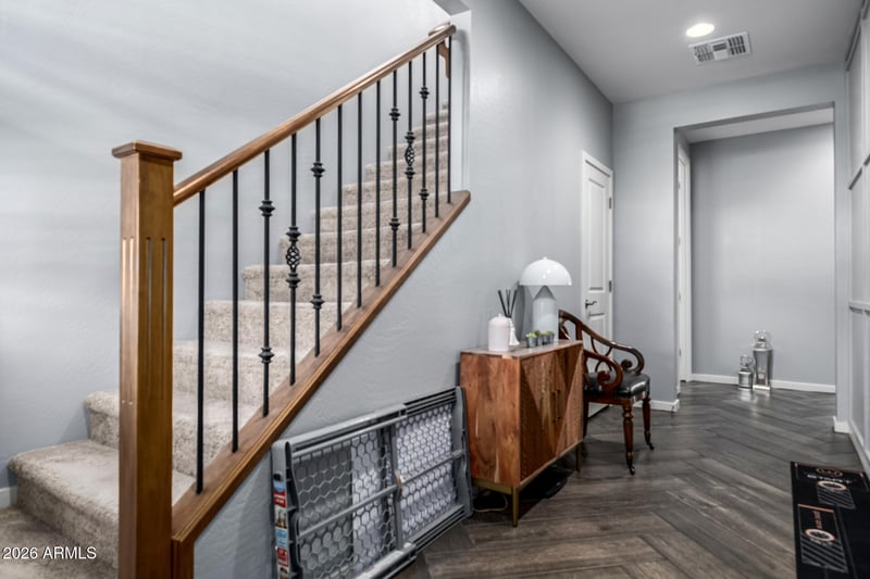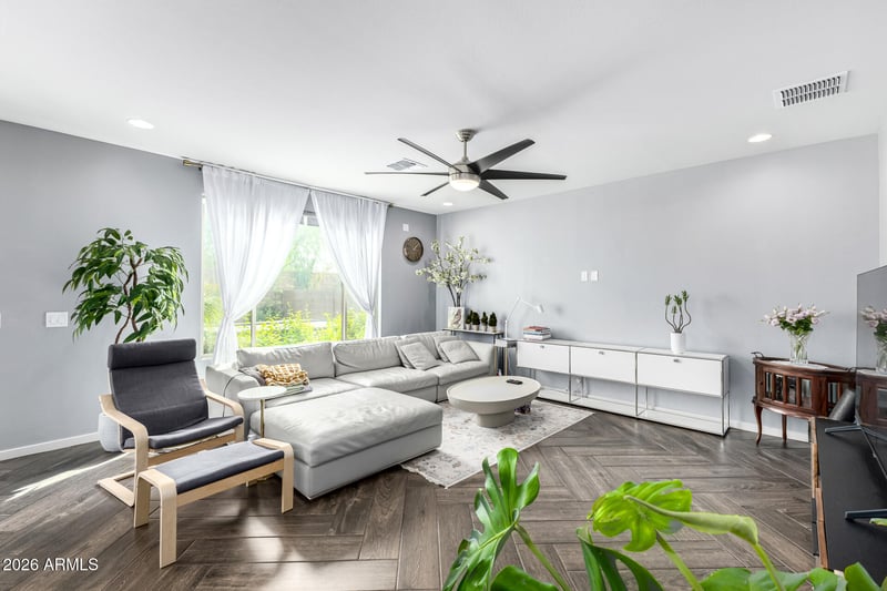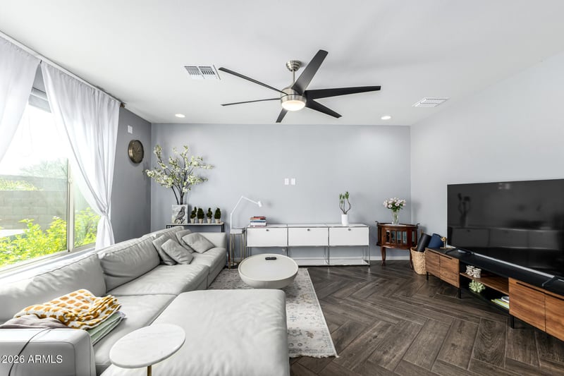 Listing details for 3557 Tina Dr, Phoenix, AZ 85050 : Perfect in every way! Located in Sky Crossing, this gorgeous two-story home is sure to impress. Providing 4 beds, 3 baths + powder room, lovely mature landscape, and a 2-car garage w/paver driveway. The interior exudes sophistication with abundant natural light, a neutral palette, contemporary light fixtures, herringbone wood-look tile flooring downstairs, and soft carpet upstairs. Designed for everyday living & entertaining, you'll love the seamlessly flowing open layout paired with sliding doors to the back! The impeccable kitchen boasts quartz counters, a tile backsplash, white shaker cabinetry, a walk-in pantry, an island w/breakfast bar, and high-end SS appliances w/cooktop gas. Spacious home office completes the main level. Head upstairs to find a versatile loft ideal for a TV area Also including the primary bedroom, featuring an ensuite with a dual quartz vanity, a sit-down tile shower, and a walk-in closet. There is also another bedroom with its own private bathroom for added comfort. If you want to relax or enjoy BBQ, the beautiful backyard awaits! A covered patio, well-laid pavers, a fire pit, artificial turf, and a hot tub complete the picture. PLUS! Sky Crossing offers a resort-style lifestyle with a community center, multiple pools & splash pad, fitness center, sports courts, parks, playgrounds, and scenic walking trails, all complemented by community events. Convenient access to shopping, dining, and major freeways. Don't miss this opportunity!