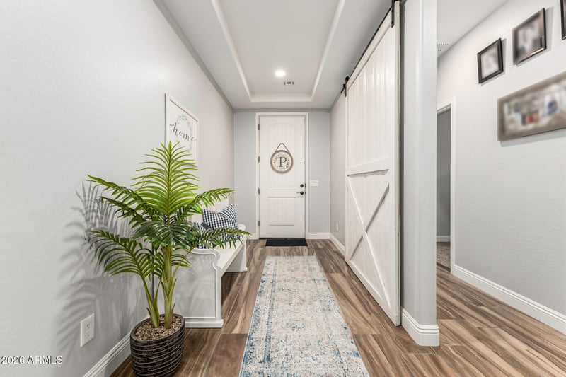 Listing details for 35665 Donovan Dr, San Tan Valley, AZ 85144 : Welcome to this beautifully upgraded, partially furnished home in desirable Morning Sun Farms. Exceptional curb appeal features a tandem garage, stone accents, and expanded concrete driveway with added walkway. The open great room offers high ceilings, recessed lighting, upgraded baseboards, neutral paint, blinds, and porcelain tile flooring throughout the main living areas.The kitchen includes solid-surface countertops, ample wood cabinetry with crown molding, stainless steel appliances, pendant lighting, walk-in pantry, and island with breakfast bar. The primary suite features new carpet, a walk-in closet, and ensuite bath with dual vanities. Secondary bedrooms also include new carpeting. The backyard is an entertainer's dream with a covered patio, travertine pavers, fire pit, pool and spa, and serene greenbelt views. A concrete slab adds additional usable outdoor space. This move-in-ready home offers comfort, style, and functionality.
