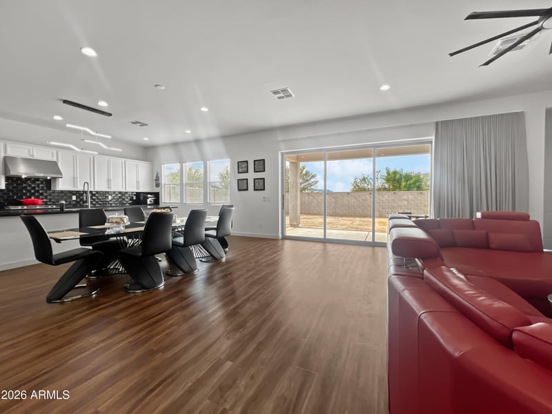 Listing details for 35678 Gemstone Way, San Tan Valley, AZ 85144 : Beautifully maintained and superbly designed for modern living, this upgraded home offers a welcoming covered porch, stunning foyer, and an expansive great room that flows into the casual dining area and large covered patio. The well appointed kitchen features a generous center island, ample cabinetry, a walk in pantry, and a modern backsplash ideal for everyday living and entertaining. A flexible bonus space provides options for a home office or media room. The private primary suite is complemented by a spa inspired bath and oversized walk in closet. Thoughtful upgrades include new flooring and baseboards, complete window coverings, upgraded hardware, wood countertops in drop zones, ceiling fans, and bidet toilets professionally installed with reinforced plumbing and dedicated electrical Additional highlights include a water softener with RO system, motorized patio curtain, solar backyard lighting, no homes behind with mountain views, and a rare four car tandem garage with exterior access.