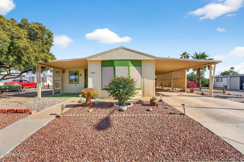 Listing details for 3609 North Dakota Ave #A, Florence, AZ 85132 : Brand-new AC and you own the land, no lot rent. Located in the desirable Florence Gardens 55+ community, this 3-bedroom, 2-bath home offers a smart layout with a finished addition that provides a spacious second living room, a large bedroom, and an updated bathroom. The original home includes two bedrooms and one bath with vaulted ceilings and updated flooring. A large shop/storage area is perfect for hobbies, tools, or extra storage. Enjoy low annual HOA and resort-style amenities including clubhouse, heated pool and spa, pickleball courts, fitness center, library, and golf course. Comfortable living with space, storage, and active adult amenities.