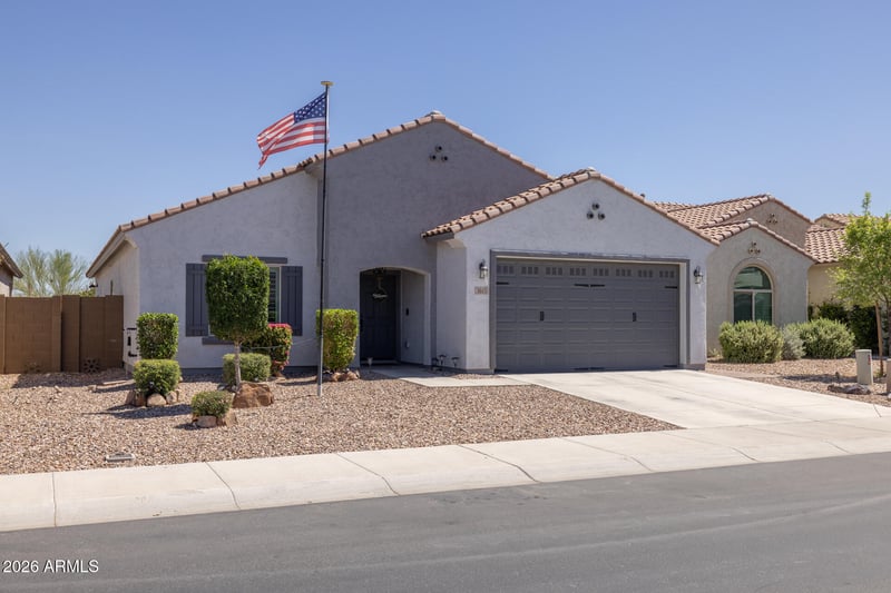 Listing details for 3613 Astoria Dr, Florence, AZ 85132 : Situated on a premium lot with no backyard neighbors, this beautifully maintained original-owner home offers 3 bedrooms, an office with glass French doors, and 2 baths across 2002 SqFt of inviting living space. The open great room flows into a stylish kitchen featuring staggered cabinetry, quartz counters, subway tile backsplash, stainless appliances, a walk-in pantry, and an island with pendant lighting. Step through sliding doors to an Arizona room and an expansive paver patio ideal for outdoor gatherings. The primary suite includes a dual-sink vanity and walk-in closet. Additional highlights include plantation shutters, upgraded laundry cabinetry, a 3-car garage with storage cabinets, and leased solar for energy savings. Enjoy Anthem Merrill Ranch Parkside's resort-style amenities, water park, fitness center, playgrounds, sport courts, and scenic parks.