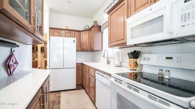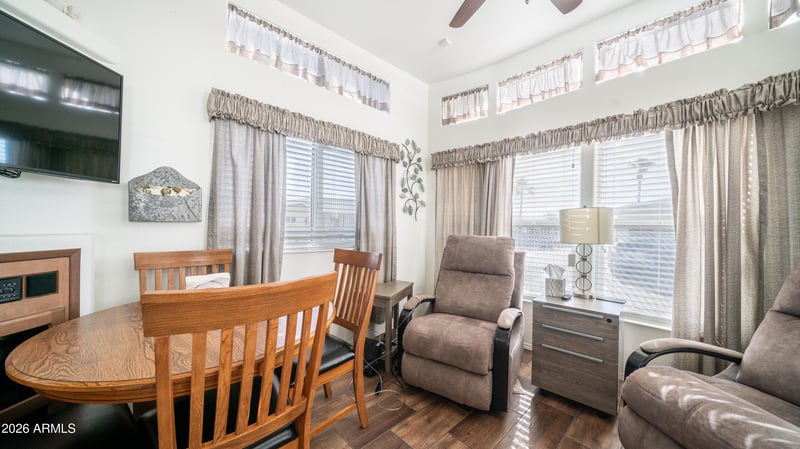 Listing details for 362 Felspar Dr, Apache Junction, AZ 85119 : This beautifully designed 2019 modern home sits on a prime corner lot & offers the perfect blend of comfort, style & functionality. From the moment you arrive, you are greeted by a spacious Trex sitting deck, the ideal spot to enjoy your morning coffee or unwind in the evening while soaking in Arizona's gorgeous weather. Step inside to high ceilings & an abundance of natural light that fills the home, creating a bright & welcoming atmosphere. Contemporary solid surface flooring enhances the modern appeal while remaining easy to maintain for everyday living. The kitchen is thoughtfully designed with plenty of counter space & storage, making it perfect for cooking, entertaining, or enjoying daily meals. Complete with a full size smooth top stove & dishwasher, the kitchen truly has everything you need. The spacious bathroom impresses with a walk in shower & additional storage, offering both comfort & convenience. The bedroom comfortably accommodates a queen size bed while still providing a cozy & relaxing retreat. Conveniently located on the raised Trex deck, you will find the washer & dryer along with extra storage space. An additional large storage or hobby room with electricity provides endless possibilities for projects, creativity, or extra space. This home perfectly blends outdoor living with modern style & thoughtful design. All of this is located within a highly active community offering endless activities including dances, bingo, card games, softball, shuffleboard, hiking groups, woodshop, silversmith, stained glass, pottery, & nonstop winter fun in sunny Arizona where resort style living truly shines.