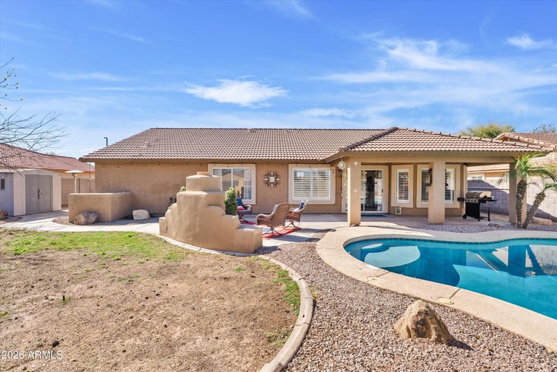 Listing details for 3620 Baranca Ct, Gilbert, AZ 85297 : Tucked away on a quiet cup-de-sac street, this beautifully remodeled 4 bedroom, 2 bath home with pool sits on an oversized lot with space, privacy and upgrades throughout. The formal living and dining room creates an inviting first impression, while the open concept layout flows seamlessly into the spacious family room featuring vaulted ceilings and abundant natural light. The fully remodeled gourmet kitchen is the heart of the home, showcasing granite countertops, white cabinets, stainless steel appliances, a large center island and walk-in pantry - ideal for entertaining and everyday living. The primary suite offers double door entry, a relaxing remodeled bathroom with tiled walk-in shower and an oversized walk-in closet. Step outside to the private backyard retreat complete with sparkling pool, grassy play area, covered patio and a cozy outdoor fireplace - perfect for Arizona evenings and year round entertaining.